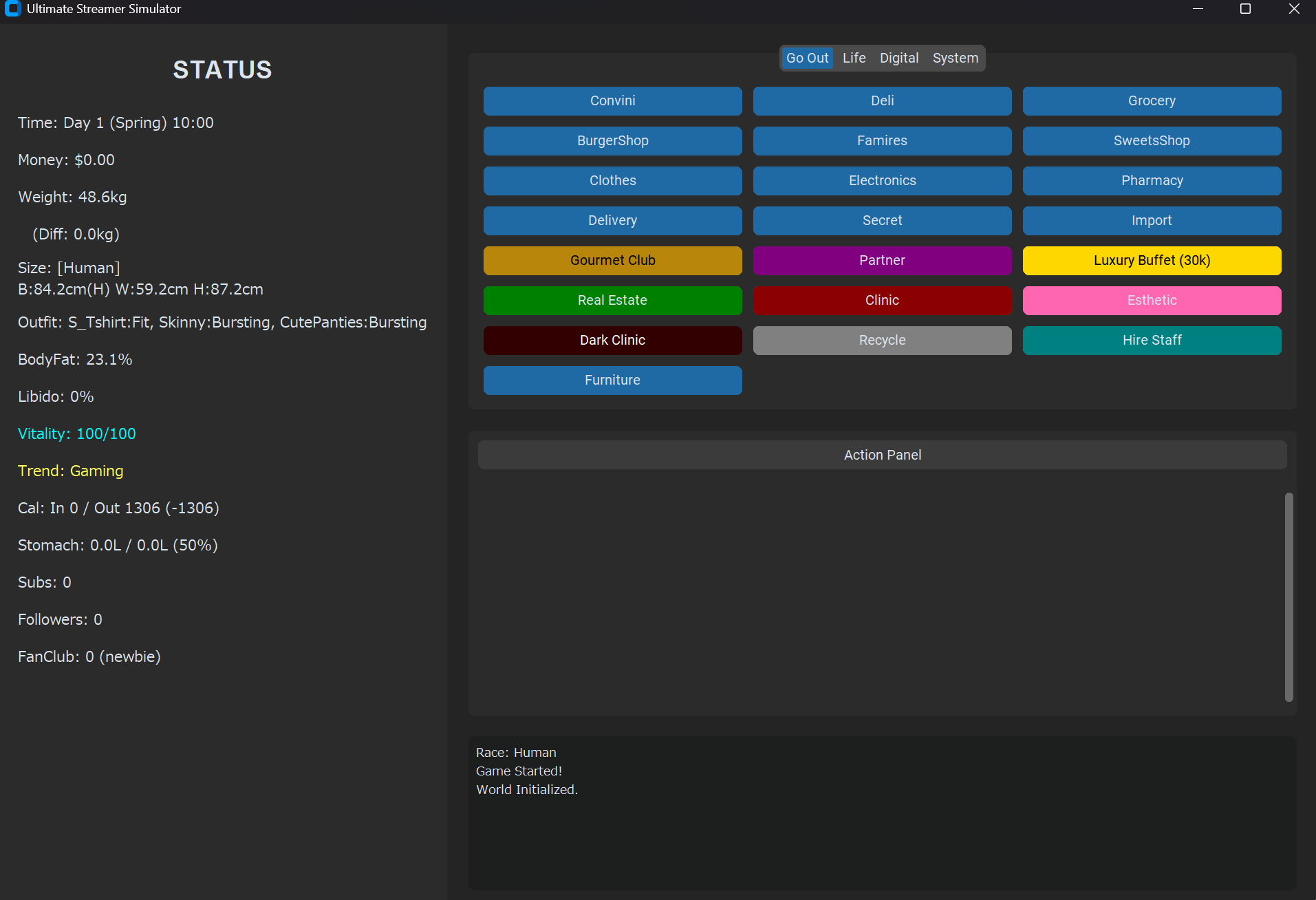 Aim to be the number one streamer in a world where "Size" is everything. This is a management simulation game focused on calories, body measurements, and economics.